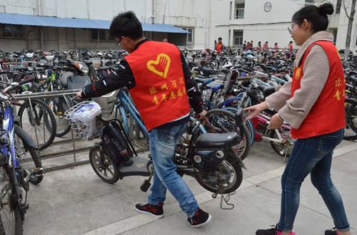 与此同时,志愿者小分队将校园内的自行车整齐摆放到规定区域内,并对前来停车、取车的同学进行引导,说明遵守校园规则、文明停车的重要性。