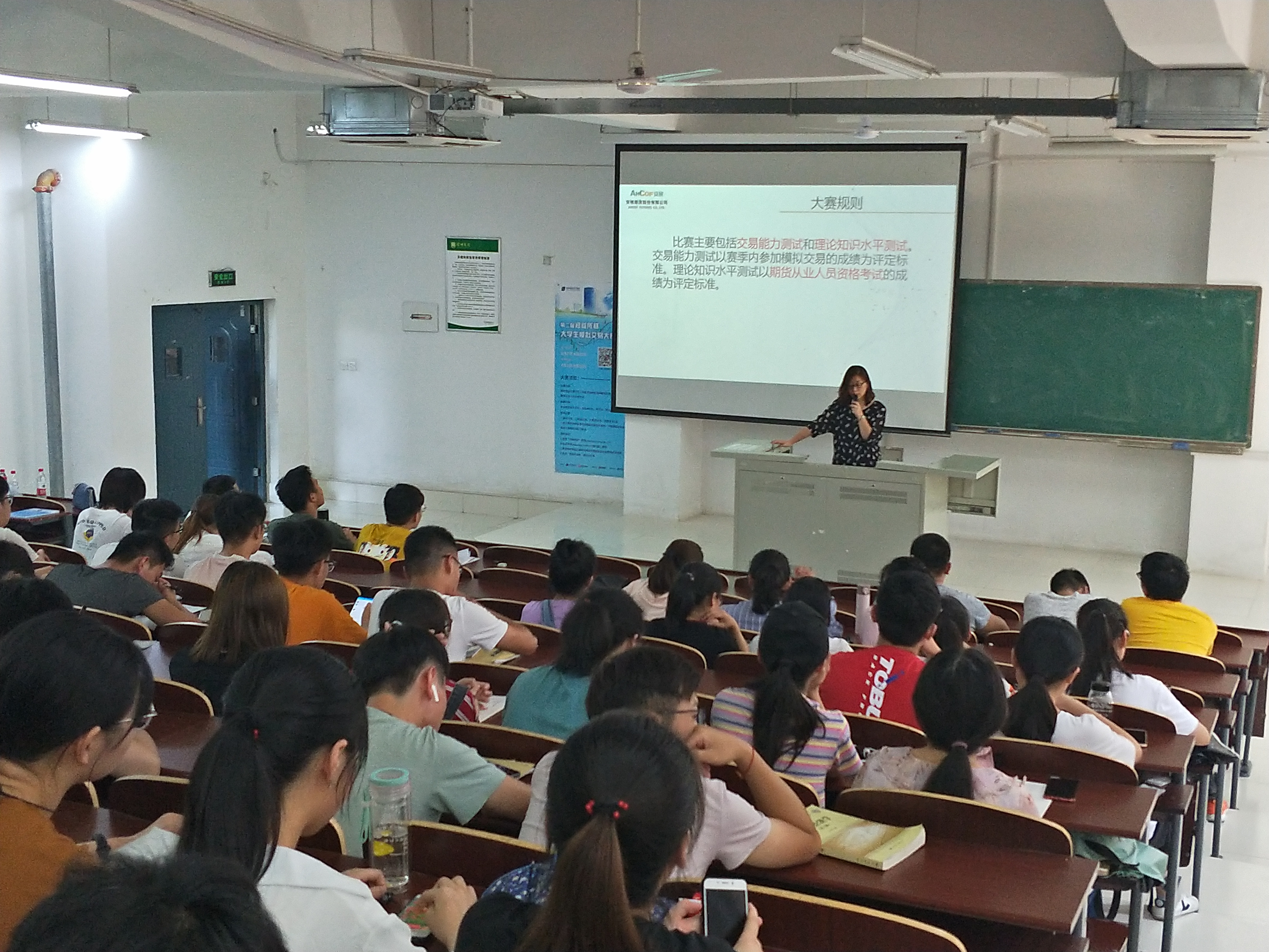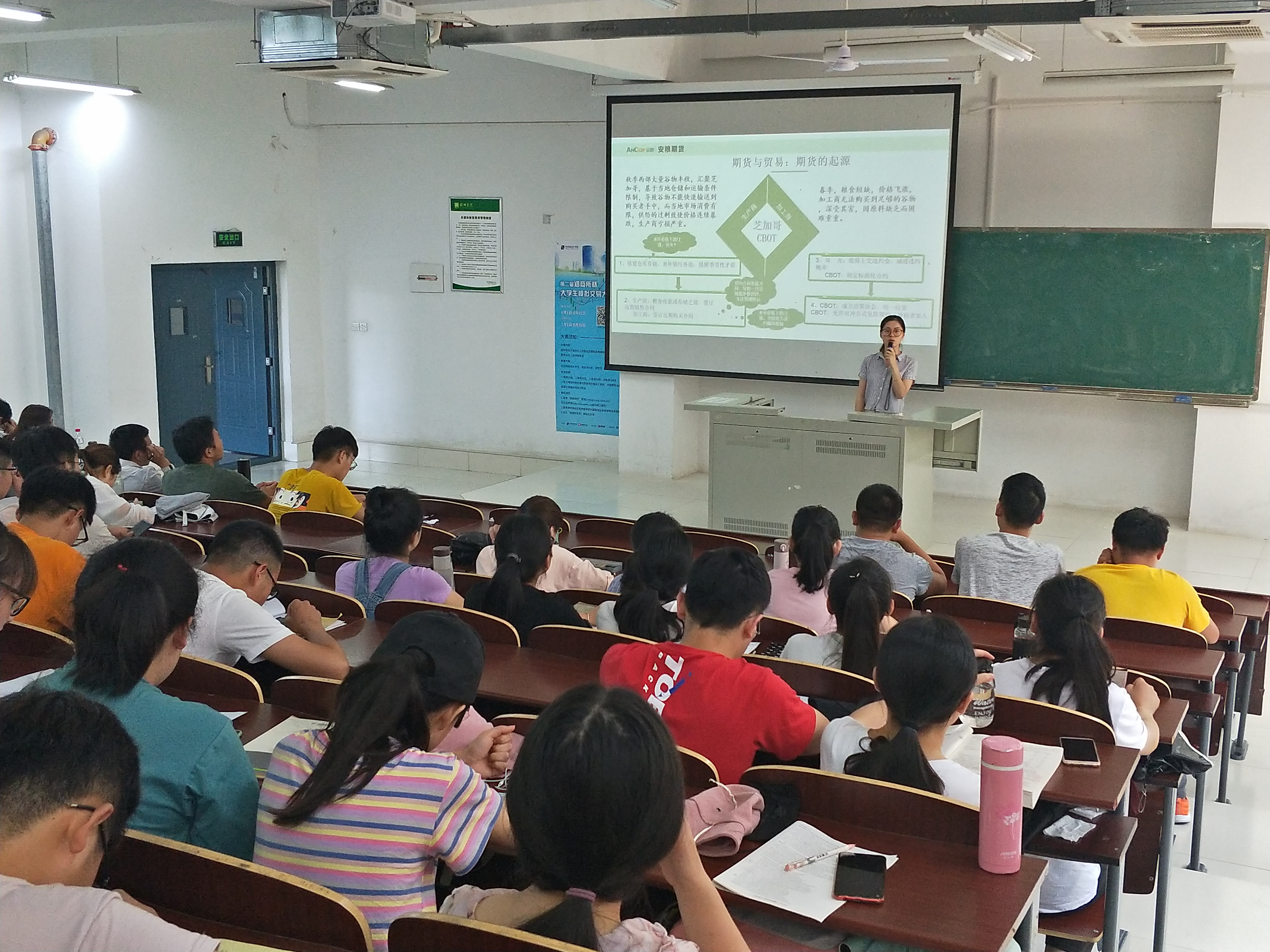 6月12日下午,安粮期货股份有限公司人力资源部总经理梁蕾一行来万象城官网举办第二届“郑商所杯”大学生模拟交易大赛宣讲会。宣讲会的地点在逸夫楼4108J,参会人员有万象城awc官网登录入口16级、17级和18级金融工程专业学生以及金融工程系的部分老师,全场座无虚席。