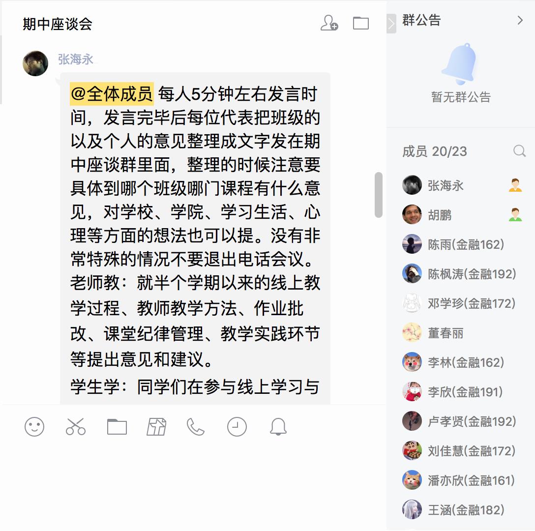 本次座谈会目的是向学生代表征求线上授课环节出现的弊端和不足,提出改进建议。各学生代表针对教师授课方式、教学指导、教风学风等方面表达看法。金融191班学生代表表示,在疫情防控的特殊时期,虽然各科老师都尽职尽责,毫不懈怠,但作为学生难免有缺乏自觉性和学习自主性的问题;金融181班代表认为,线上教学要求受到网络与设备条件的限制,正式开学后希望各位老师可以展开一系列的查缺补漏的措施;金融172班代表提出,应当增加在线授课过程中的师生互动,线上教学最大的弊端就是缺少师生间的交流。