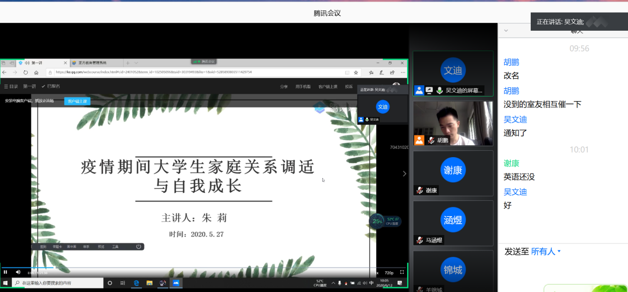 同学们在直播过程中在线讨论热烈,通过本次班会,缓解了同学们在家的心理压力,以及提出解决缓和亲子关系的方法,使同学们能够在家与家人更好的相处。除此之外,辅导员胡鹏老师着重提出,要求大家在家要保持良好的作息时间,保持课内外的学习,提高信息判断能力,做到不信谣,不传谣。同时按照学校要求做好每天的打卡工作,为我们接下来的开学做好准备。(通讯员:李晨晨)