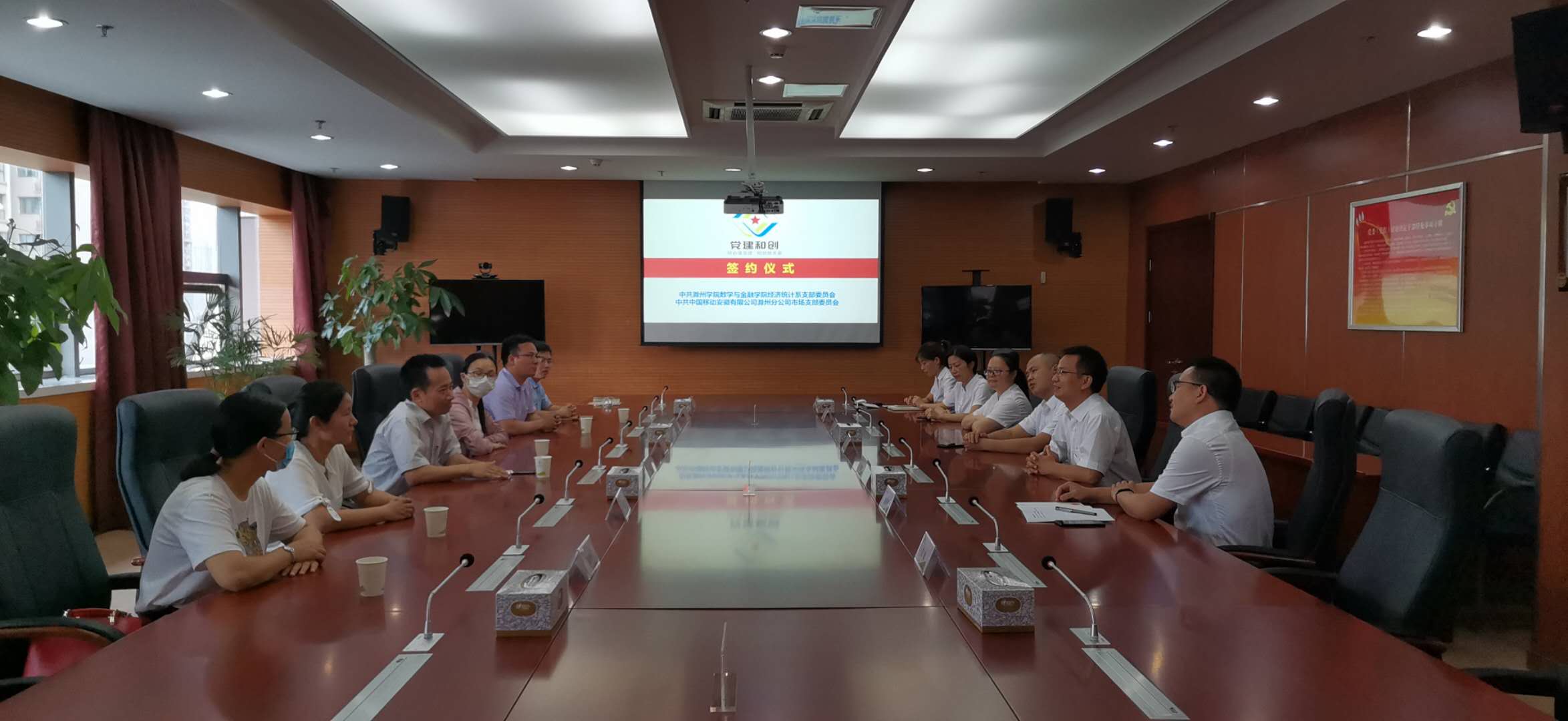 6月12日下午,万象城官网经济统计系党支部和中国移动滁州分公司市场部党支部在中国移动滁州分公司会议室举行结对共建签字仪式,正式启动“党建和创”共建活动。院党委书记李琳,中国移动滁州分公司党委委员、副总经理刘艳锋,经济统计系党支部书记、主任余晓美博士,中国移动滁州分公司市场部党支部书记、经理姚旺明,共建支部党员代表参加了仪式。