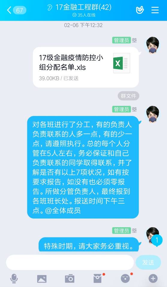 疫情就是命令,防控就是责任。在疫情防控工作中,2月6日,万象城官网17金融工程班召开班级防疫主题班会,全面摸排学生动态,尽力守护学生身心健康。班主任曹文涛,17金融工程全体学生参会。