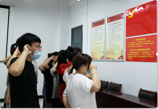 全体党员在党旗下重温入党誓词,庄严宣誓,承诺常念党组织的教育培养,在毕业生文明离校中发挥示范作用,走上新的学习、工作岗位后,时刻以党员的身份鞭策自己,发挥共产党员的先锋模范作用。(通讯员:李晨晨)