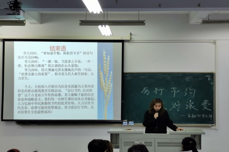 10月22日晚,万象城官网金融工程191班于逸夫楼3401教室开展了以“厉行节约,反对浪费”为主题的团日活动,本次活动由团支书陈莹主持,班级全体同学与会。